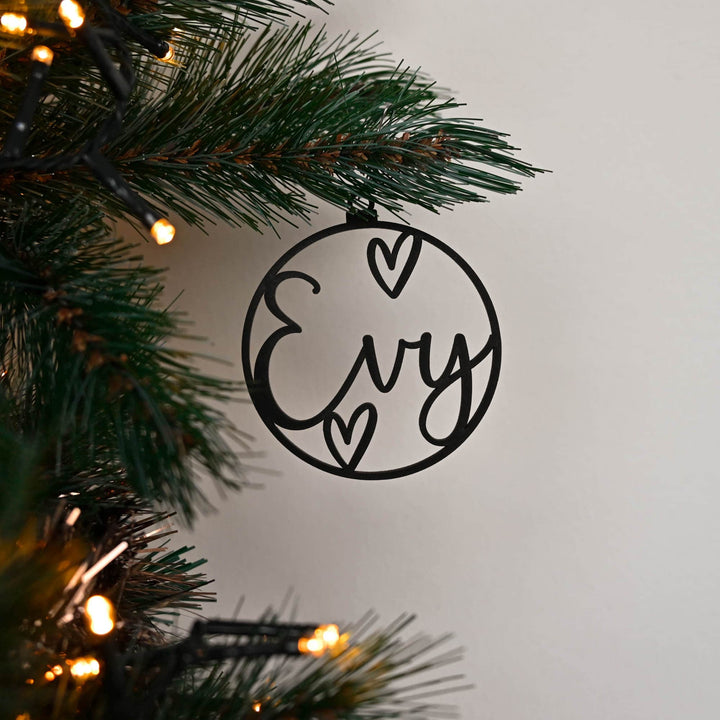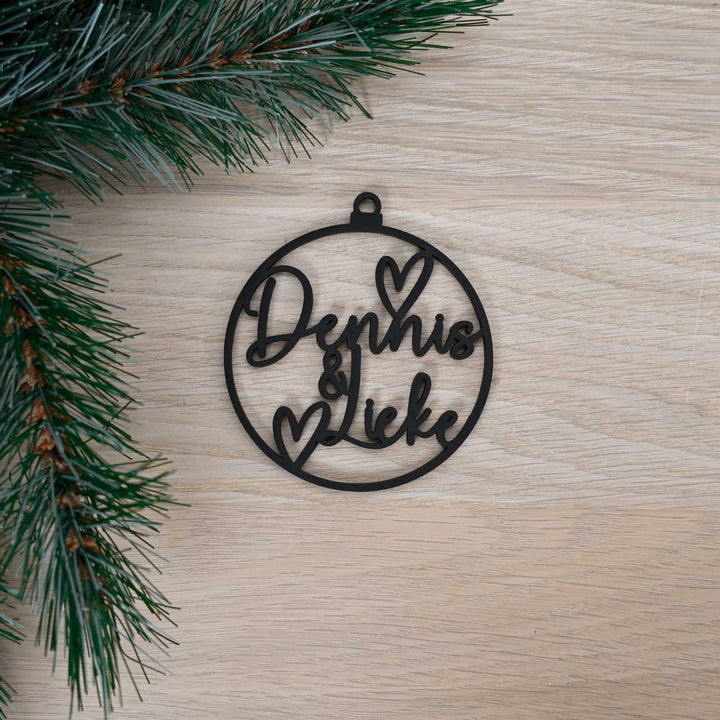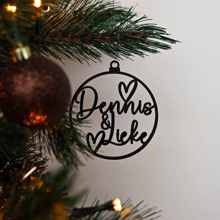Bij deze kerstbal kan je zelf de naam of namen invullen! De naam heeft een maximale lengte van 13 tekens. Als je voor 2 namen kiest zullen deze wat schuin onder elkaar komen met een & teken ertussen. De hartjes kunnen op een andere plek komen dan op de foto staat, het zullen er wel altijd 2 zijn.